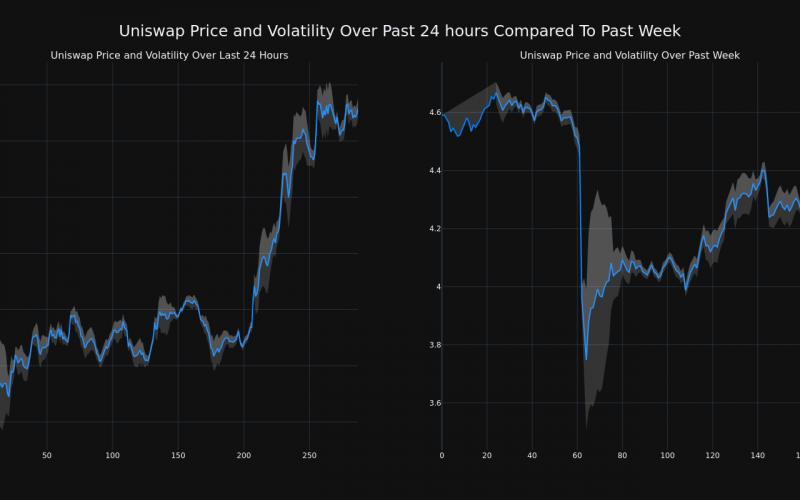 The chart below compares the price movement and volatility for Uniswap over the past 24 hours (left) to its price movement over the past week (right). The gray bands are Bollinger Bands, measuring the volatility for both the daily and weekly price movements. The wider the bands are, or the larger the gray area is at any given moment, the larger the volatility.