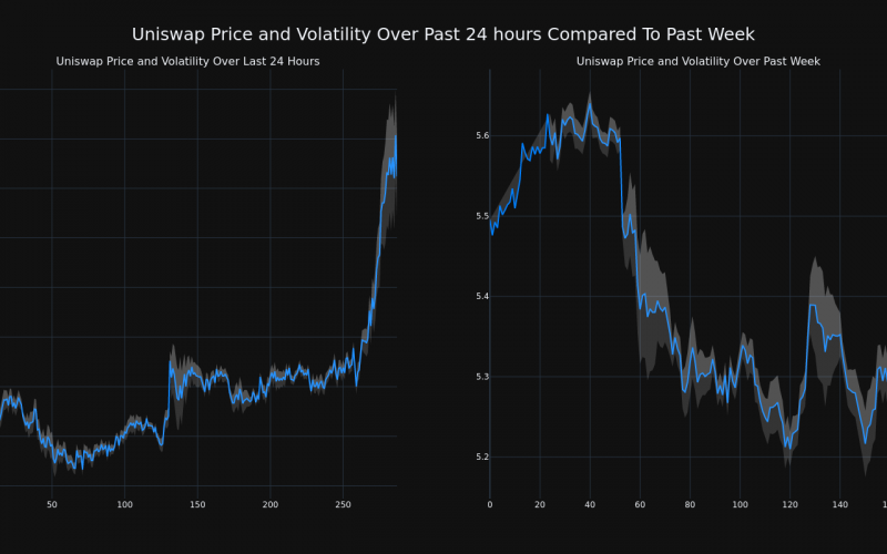 The chart below compares the price movement and volatility for Uniswap over the past 24 hours (left) to its price movement over the past week (right). The gray bands are Bollinger Bands, measuring the volatility for both the daily and weekly price movements. The wider the bands are, or the larger the gray area is at any given moment, the larger the volatility.