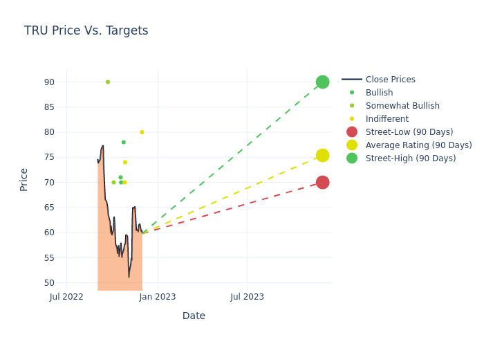 In the last 3 months, 10 analysts have offered 12-month price targets for TransUnion. The company has an average price target of $76.7 with a high of $90.00 and a low of $70.00.
