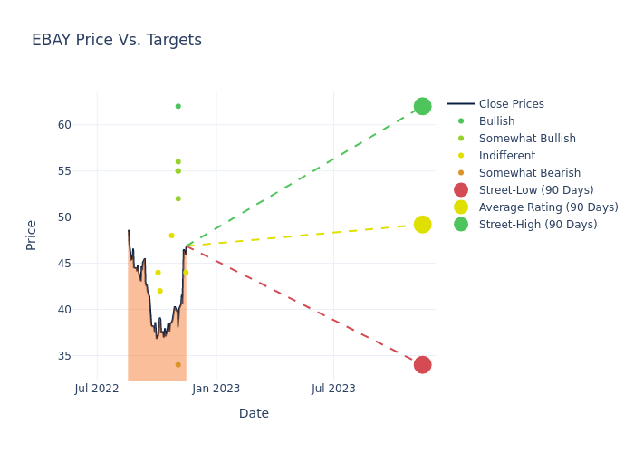 According to 12 analyst offering 12-month price targets in the last 3 months, eBay has an average price target of $48.42 with a high of $62.00 and a low of $33.00.