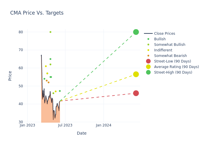 In the last 3 months, 15 analysts have offered 12-month price targets for Comerica. The company has an average price target of $56.22 with a high of $80.00 and a low of $46.00.
