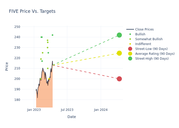In the last 3 months, 16 analysts have offered 12-month price targets for Five Below. The company has an average price target of $225.94 with a high of $242.00 and a low of $200.00.