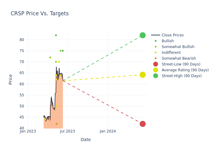 In the last 3 months, 17 analysts have offered 12-month price targets for CRISPR Therapeutics. The company has an average price target of $66.29 with a high of $82.00 and a low of $42.00.