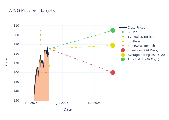 In the last 3 months, 17 analysts have offered 12-month price targets for Wingstop. The company has an average price target of $183.82 with a high of $205.00 and a low of $143.00.
