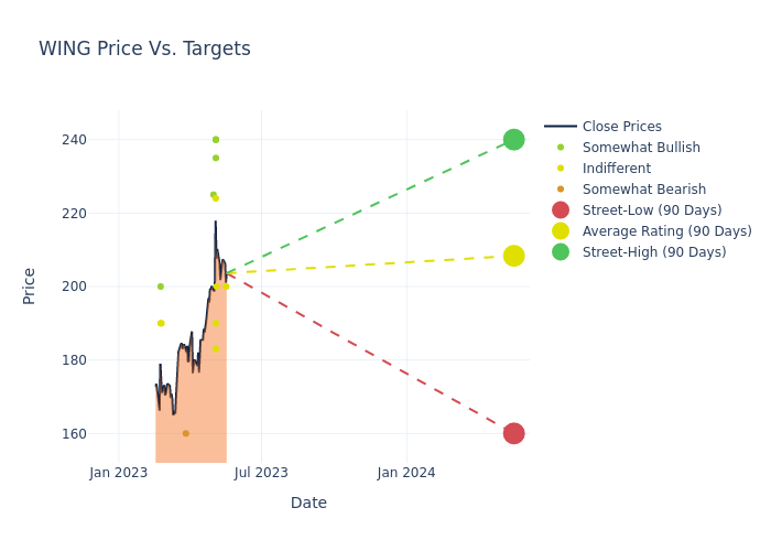 In the last 3 months, 25 analysts have offered 12-month price targets for Wingstop. The company has an average price target of $198.44 with a high of $240.00 and a low of $160.00.