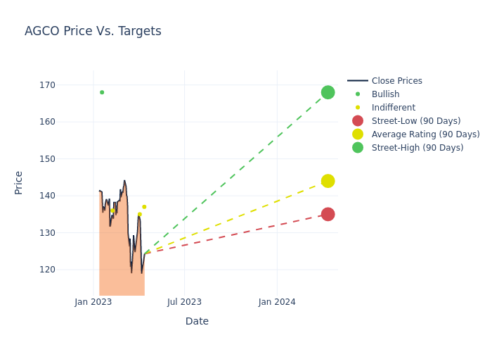 In the last 3 months, 4 analysts have offered 12-month price targets for AGCO. The company has an average price target of $144.0 with a high of $168.00 and a low of $135.00.