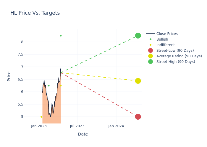In the last 3 months, 4 analysts have offered 12-month price targets for Hecla Mining. The company has an average price target of $6.94 with a high of $8.25 and a low of $6.25.