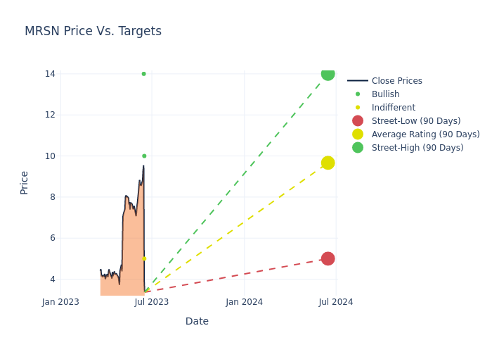 In the last 3 months, 4 analysts have offered 12-month price targets for Mersana Therapeutics. The company has an average price target of $11.0 with a high of $15.00 and a low of $5.00.