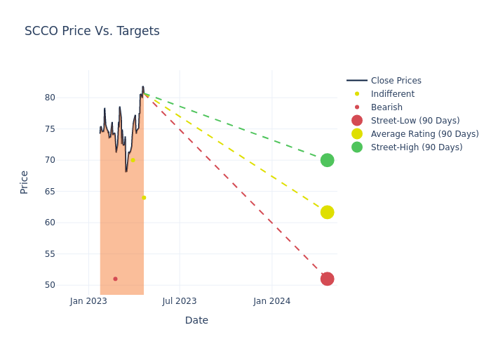 According to 4 analyst offering 12-month price targets in the last 3 months, Southern Copper has an average price target of $60.25 with a high of $70.00 and a low of $51.00.