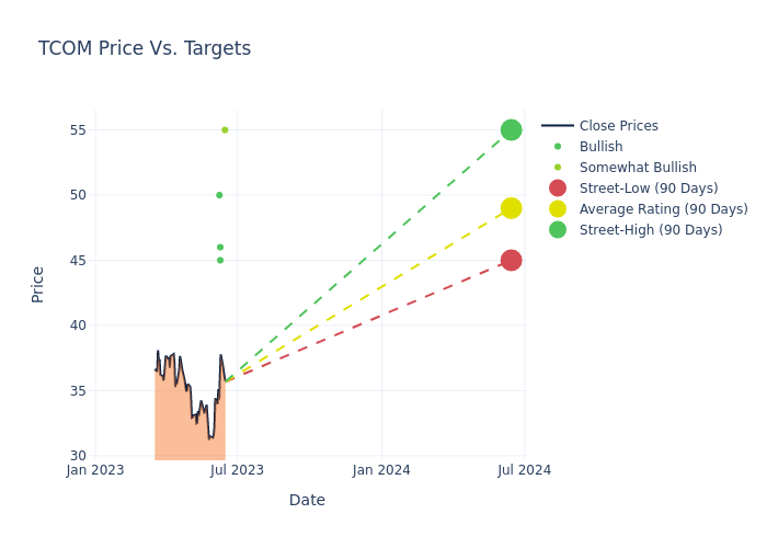 In the last 3 months, 4 analysts have offered 12-month price targets for Trip.com Group. The company has an average price target of $49.0 with a high of $55.00 and a low of $45.00.