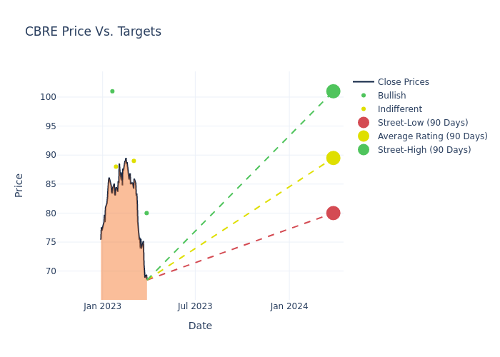 In the last 3 months, 5 analysts have offered 12-month price targets for CBRE Group. The company has an average price target of $91.6 with a high of $101.00 and a low of $80.00.