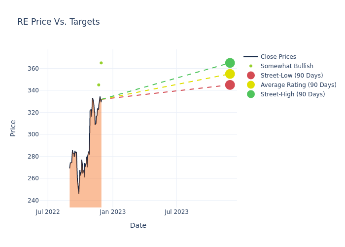 In the last 3 months, 5 analysts have offered 12-month price targets for Everest Re Group. The company has an average price target of $337.0 with a high of $365.00 and a low of $320.00.
