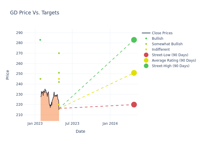 In the last 3 months, 5 analysts have offered 12-month price targets for General Dynamics. The company has an average price target of $245.6 with a high of $270.00 and a low of $220.00.