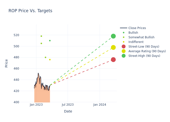In the last 3 months, 5 analysts have offered 12-month price targets for Roper Techs. The company has an average price target of $497.8 with a high of $518.00 and a low of $476.00.