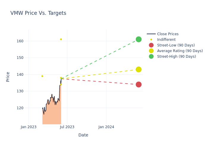 In the last 3 months, 5 analysts have offered 12-month price targets for VMware. The company has an average price target of $139.4 with a high of $161.00 and a low of $125.00.