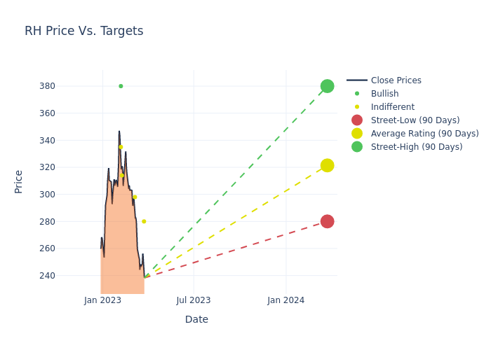 According to 6 analyst offering 12-month price targets in the last 3 months, RH has an average price target of $322.83 with a high of $380.00 and a low of $280.00.