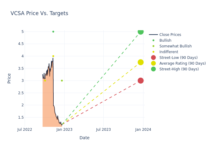 In the last 3 months, 6 analysts have offered 12-month price targets for Vacasa. The company has an average price target of $4.5 with a high of $7.00 and a low of $3.00.