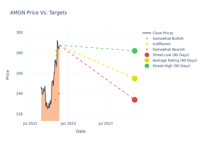 According to 7 analyst offering 12-month price targets in the last 3 months, Amgen has an average price target of $255.29 with a high of $282.00 and a low of $234.00.