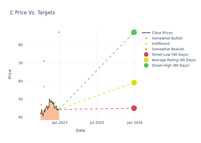 In the last 3 months, 7 analysts have offered 12-month price targets for Citigroup. The company has an average price target of $57.0 with a high of $87.00 and a low of $44.00.