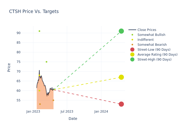 These 7 analysts have an average price target of $66.71 versus the current price of Cognizant Tech Solns at $60.44, implying upside.