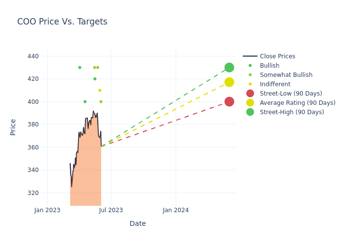 According to 7 analyst offering 12-month price targets in the last 3 months, Cooper Companies has an average price target of $417.14 with a high of $430.00 and a low of $400.00.