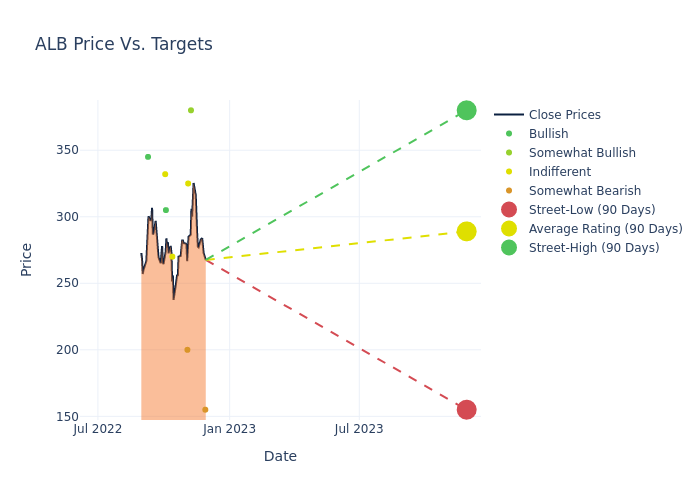 In the last 3 months, 9 analysts have offered 12-month price targets for Albemarle. The company has an average price target of $298.11 with a high of $380.00 and a low of $155.00.
