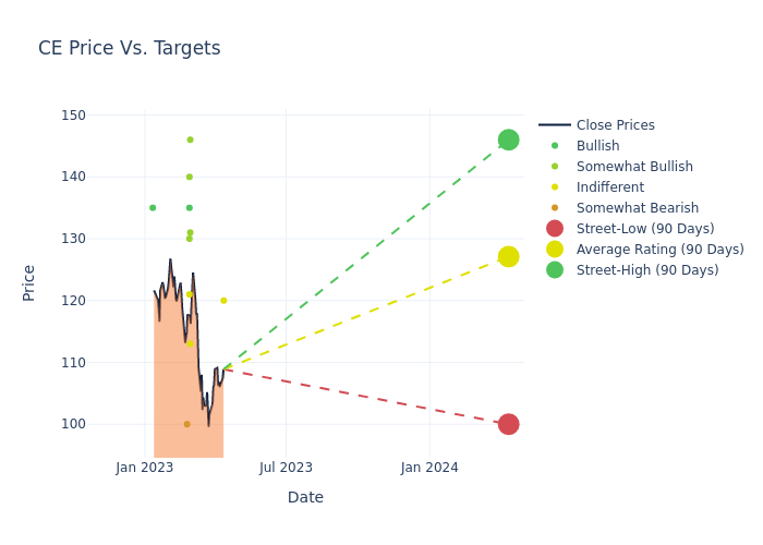 According to 9 analyst offering 12-month price targets in the last 3 months, Celanese has an average price target of $126.22 with a high of $146.00 and a low of $100.00.