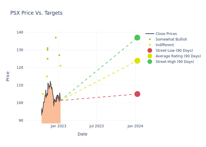 In the last 3 months, 9 analysts have offered 12-month price targets for Phillips 66. The company has an average price target of $127.33 with a high of $155.00 and a low of $105.00.