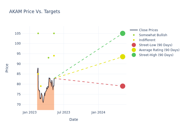 In the last 3 months, 6 analysts have offered 12-month price targets for Akamai Techs. The company has an average price target of $93.5 with a high of $105.00 and a low of $79.00.