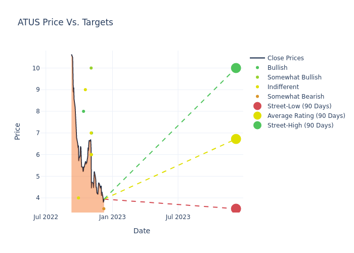 In the last 3 months, 12 analysts have offered 12-month price targets for Altice USA. The company has an average price target of $7.04 with a high of $10.00 and a low of $3.50.