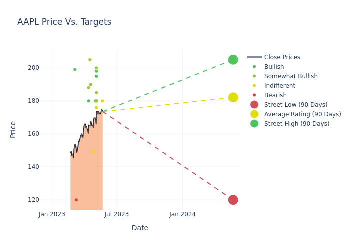 In the last 3 months, 27 analysts have offered 12-month price targets for Apple. The company has an average price target of $180.33 with a high of $205.00 and a low of $120.00.