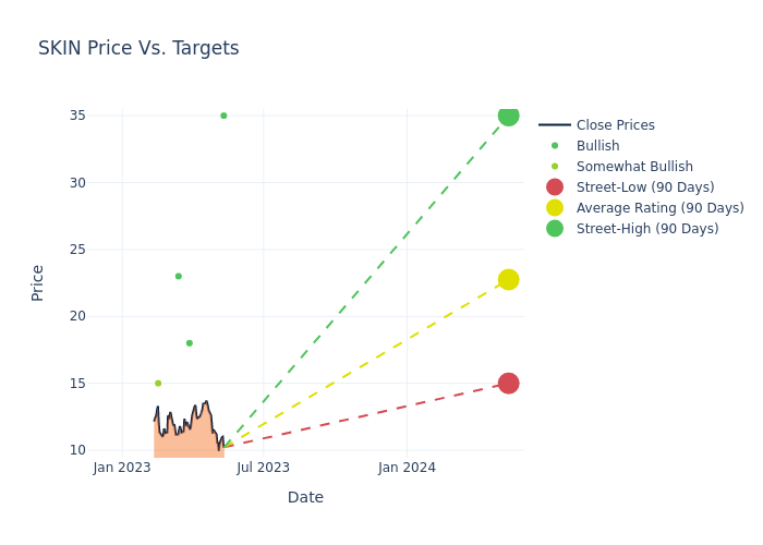 In the last 3 months, 6 analysts have offered 12-month price targets for Beauty Health. The company has an average price target of $24.83 with a high of $35.00 and a low of $15.00.