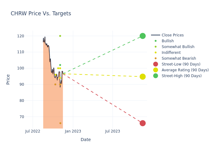 According to 12 analyst offering 12-month price targets in the last 3 months, C.H. Robinson Worldwide has an average price target of $93.5 with a high of $120.00 and a low of $66.00.