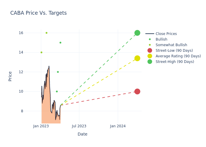 In the last 3 months, 6 analysts have offered 12-month price targets for Cabaletta Bio. The company has an average price target of $13.17 with a high of $16.00 and a low of $10.00.