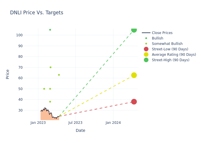 In the last 3 months, 9 analysts have offered 12-month price targets for Denali Therapeutics. The company has an average price target of $67.44 with a high of $105.00 and a low of $38.00.