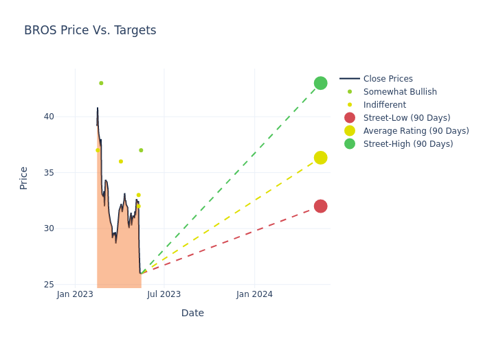 In the last 3 months, 9 analysts have offered 12-month price targets for Dutch Bros. The company has an average price target of $36.56 with a high of $43.00 and a low of $32.00.