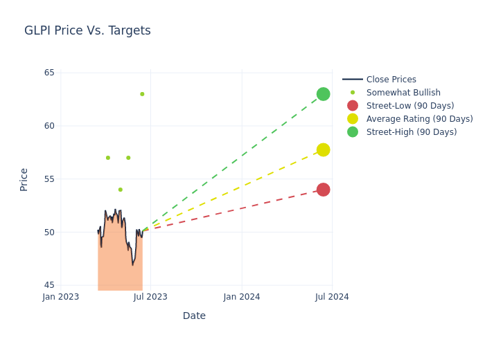 According to 7 analyst offering 12-month price targets in the last 3 months, Gaming and Leisure Props has an average price target of $57.43 with a high of $63.00 and a low of $54.00.