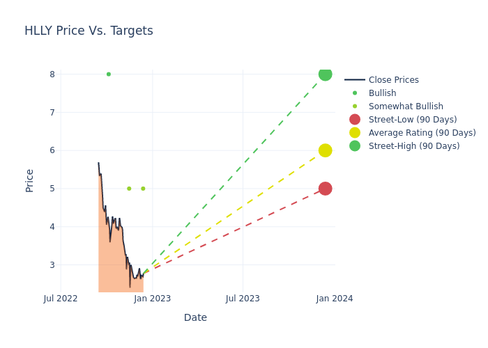 According to 4 analyst offering 12-month price targets in the last 3 months, Holley has an average price target of $6.25 with a high of $8.00 and a low of $5.00.