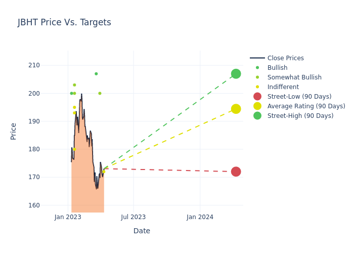 According to 11 analyst offering 12-month price targets in the last 3 months, JB Hunt Transport Servs has an average price target of $191.64 with a high of $207.00 and a low of $172.00.