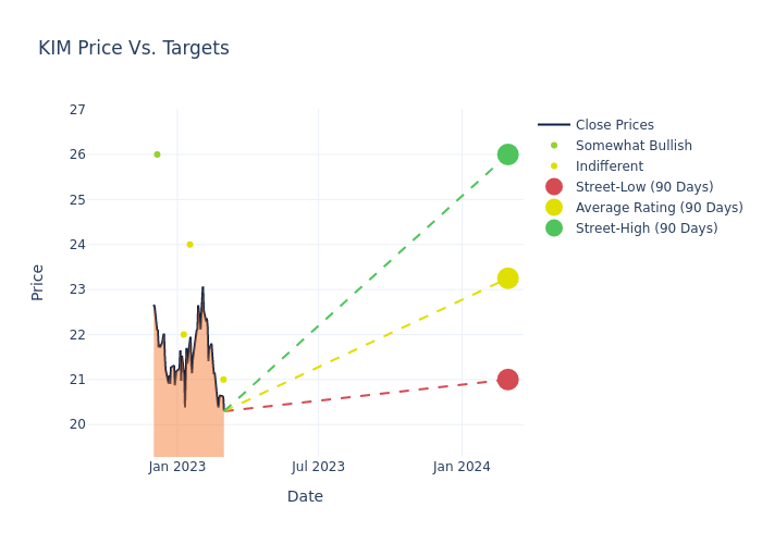 In the last 3 months, 5 analysts have offered 12-month price targets for Kimco Realty. The company has an average price target of $22.8 with a high of $26.00 and a low of $21.00.