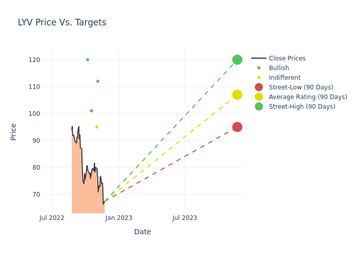 According to 4 analyst offering 12-month price targets in the last 3 months, Live Nation Entertainment has an average price target of $107.0 with a high of $120.00 and a low of $95.00.