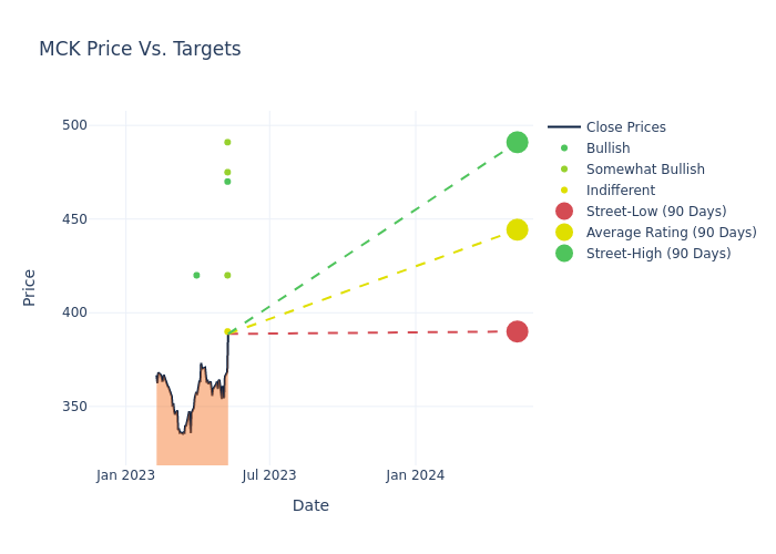 In the last 3 months, 6 analysts have offered 12-month price targets for McKesson. The company has an average price target of $444.33 with a high of $491.00 and a low of $390.00.