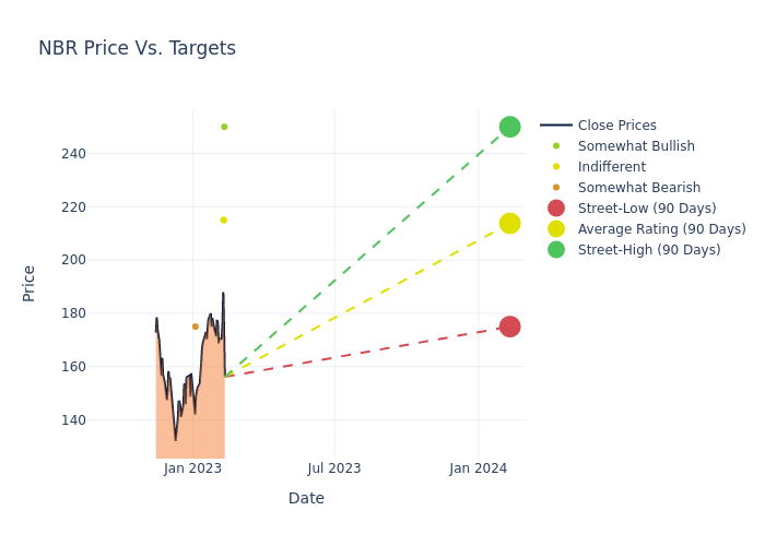 According to 5 analyst offering 12-month price targets in the last 3 months, Nabors Industries has an average price target of $211.0 with a high of $250.00 and a low of $175.00.