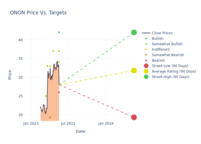According to 15 analyst offering 12-month price targets in the last 3 months, On Holding has an average price target of $32.75 with a high of $42.00 and a low of $19.30.