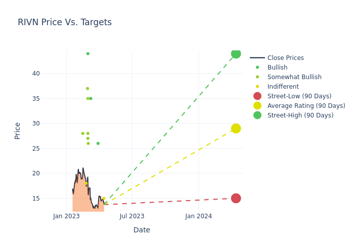 In the last 3 months, 15 analysts have offered 12-month price targets for Rivian Automotive. The company has an average price target of $30.13 with a high of $44.00 and a low of $15.00.