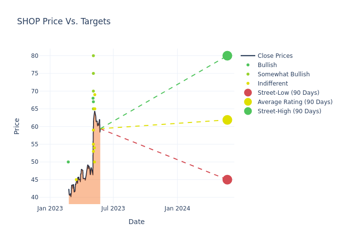In the last 3 months, 19 analysts have offered 12-month price targets for Shopify. The company has an average price target of $60.95 with a high of $80.00 and a low of $45.00.