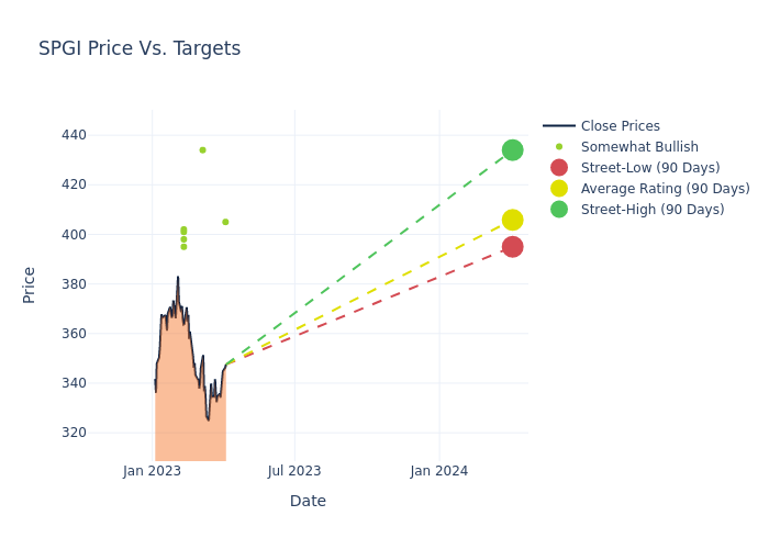 In the last 3 months, 7 analysts have offered 12-month price targets for S&P Global. The company has an average price target of $405.43 with a high of $434.00 and a low of $395.00.