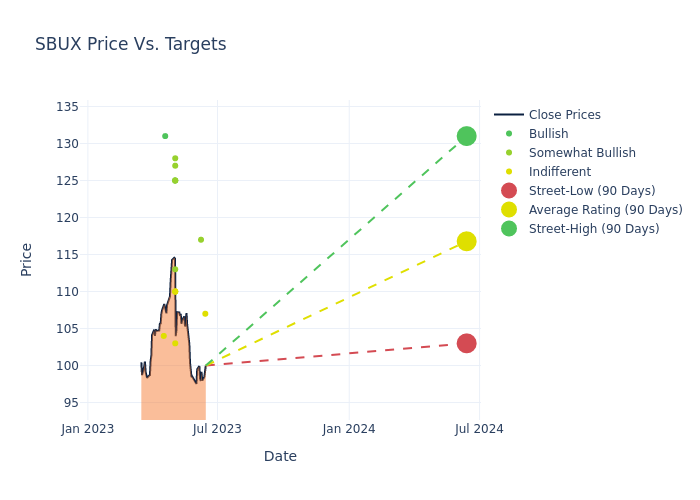 In the last 3 months, 17 analysts have offered 12-month price targets for Starbucks. The company has an average price target of $116.94 with a high of $131.00 and a low of $103.00.