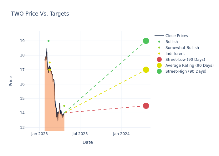 According to 6 analyst offering 12-month price targets in the last 3 months, Two Harbors Inv has an average price target of $17.17 with a high of $19.00 and a low of $14.50.