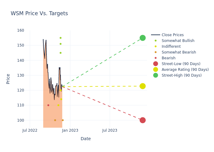 In the last 3 months, 9 analysts have offered 12-month price targets for Williams-Sonoma. The company has an average price target of $122.78 with a high of $155.00 and a low of $100.00.